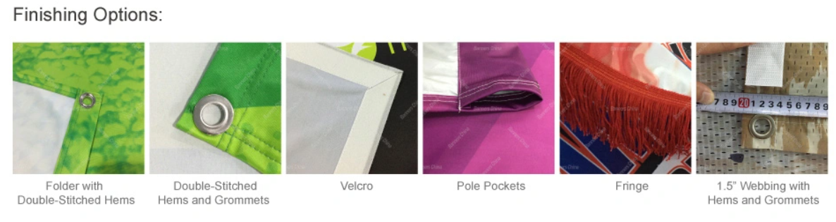 Hot knife edge-finishing, Grommets/Eyelets, Pole Pockets, Sewn in Rope, Velcro, Fringe, Webbing with Hems and Eyelets, Silicone Edge Graphic.