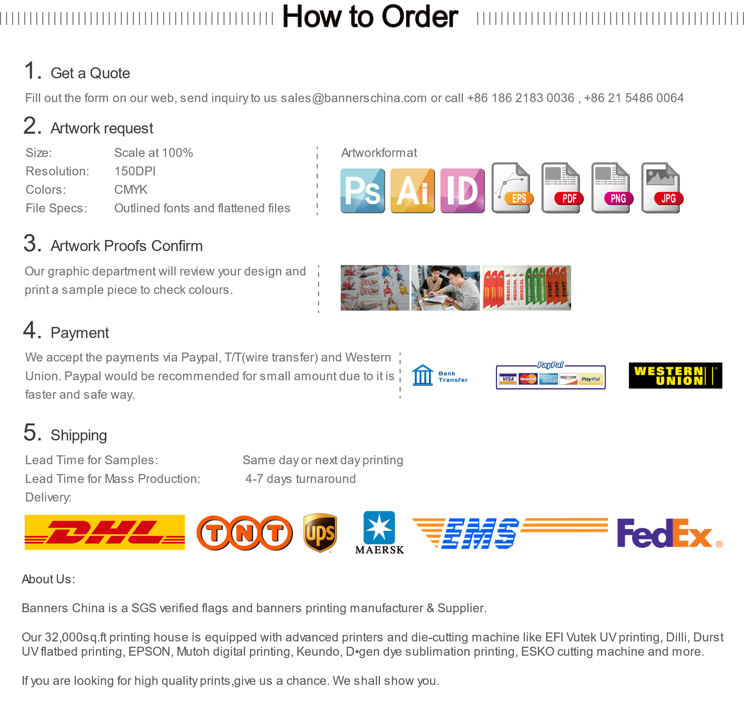 Fill out the form on our web, send email to us ( sales@bannerschina.com ) or call +86 186 2183 0036, +86 21 54860064