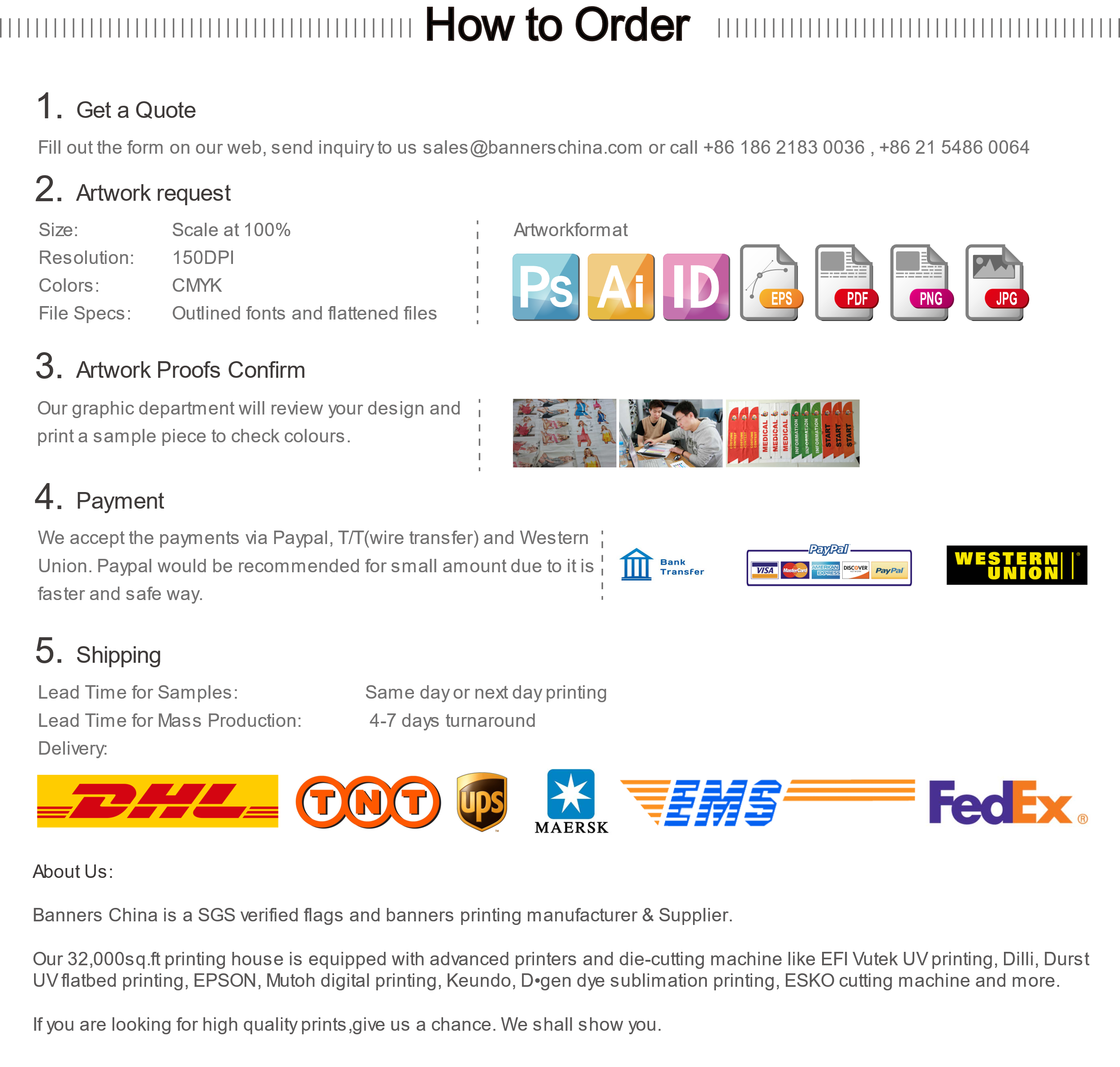 Fill out the form on our web, send email to us ( sales@bannerschina.com ) or call +86 186 2183 0036, +86 21 54860064